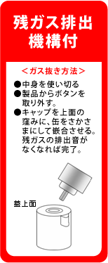 廃棄の際にエアゾール缶の中身を完全に出し切る必要があります。使い切ったと思っていても、噴射剤や中身が残っている場合があります。その為、中身を完全・確実に出し切る為にエアゾール業界で推奨している機構です。